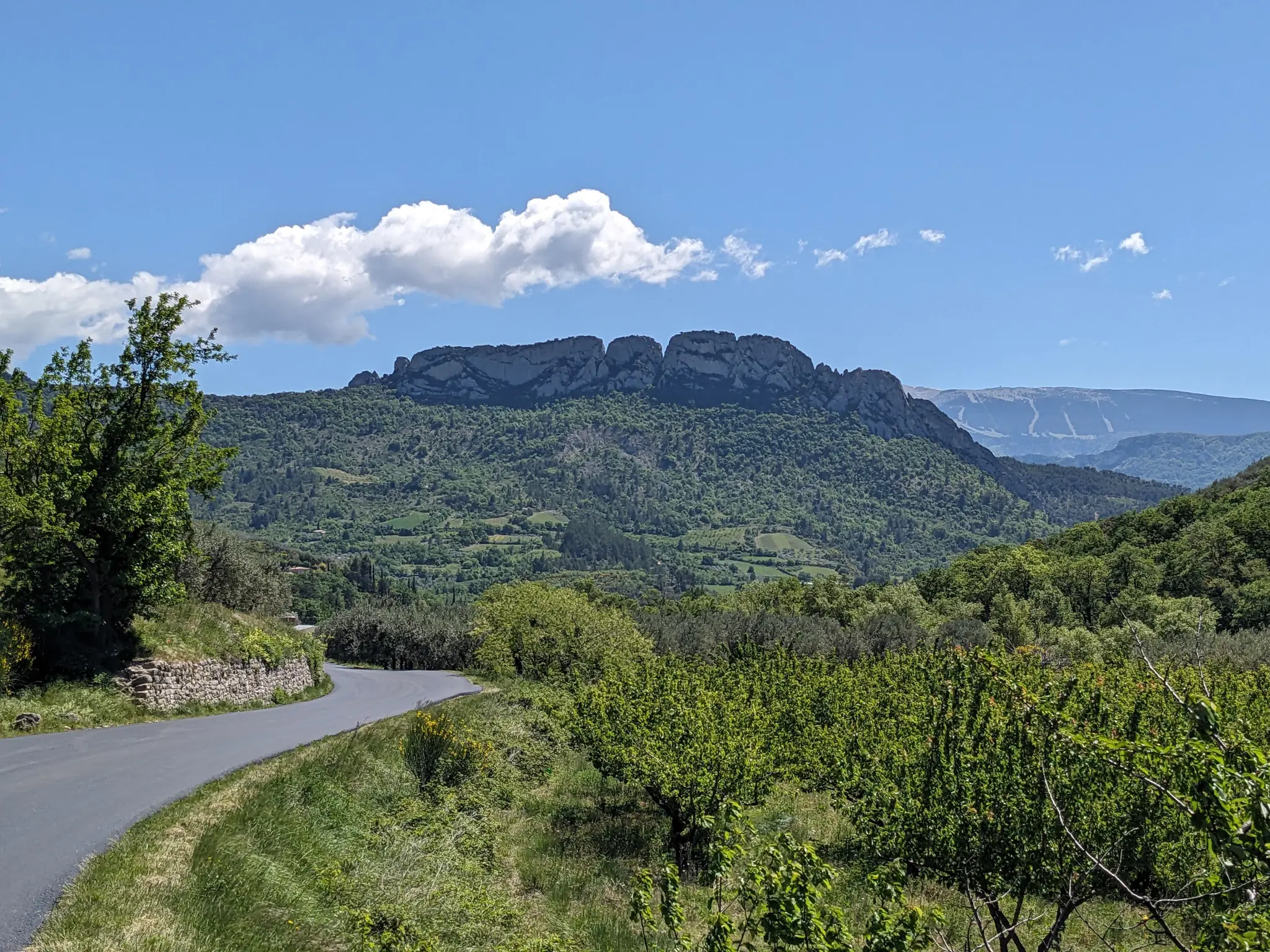 Après avoir traversé Crestet et Entrechaux, le parcours suit la vallée de l’Ouvèze en direction de Buis-les-Baronnies avant de s’élever progressivement vers les reliefs sauvages de Sainte-Jalle, Rochebrune et Montaulieu. Les routes deviennent plus sinueuses et offrent des panoramas remarquables sur les collines méditerranéennes et les paysages préalpins.
